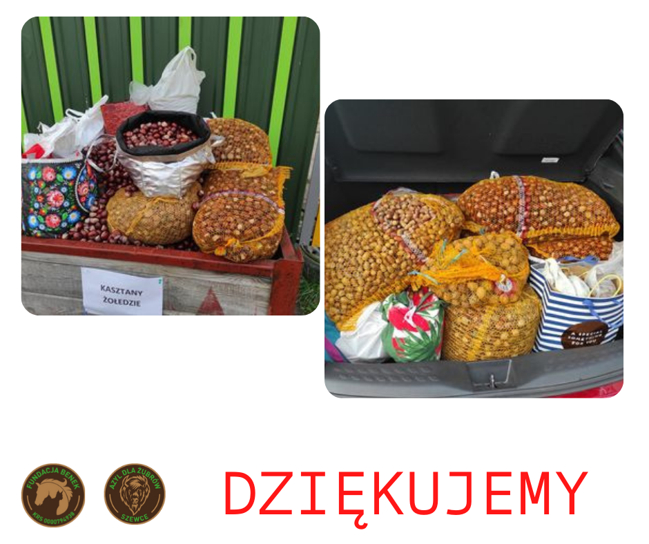 Bardzo dziękujemy dzieciom z klasy 3b szkoły w Siekierkach Wielkich za zebranie imponującej ilości orzechów, kasztanów i żołędzi dla mieszkańców Benkowa. Rodzicom zaś, dziękujemy za dowiezienie tych przysmaków.Żubry osobiście sprawdziły jakość i kazały przekazać, że wszystko bardzo smakuje.PS Dodały, że nadal można dowozić dary.