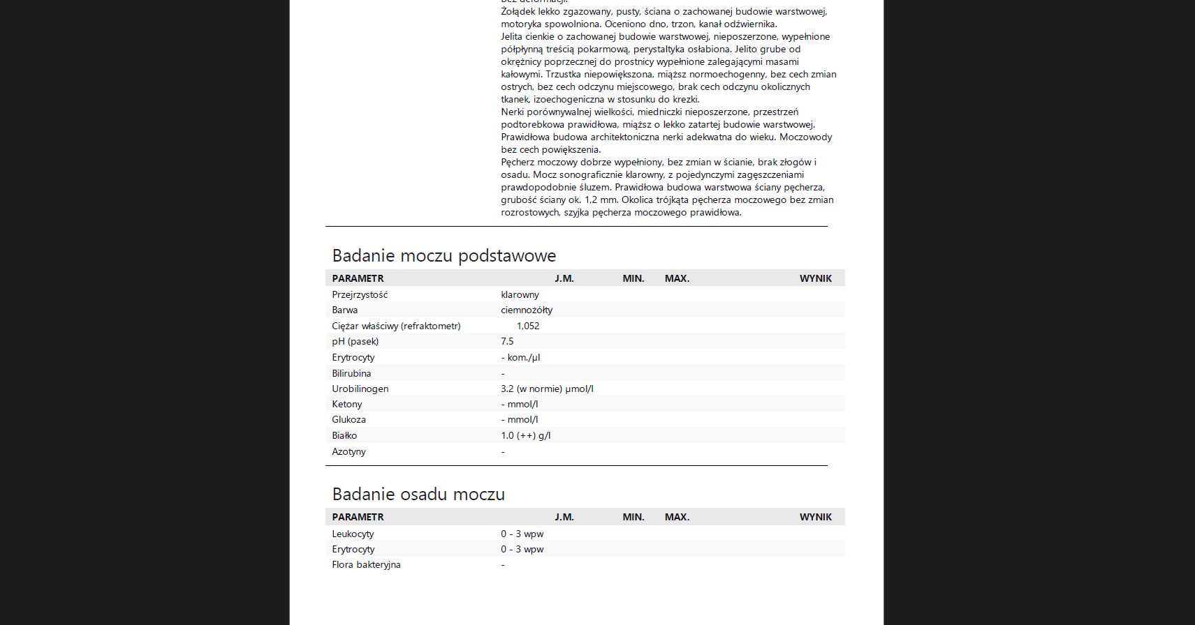 Badanie USG wykazało, że Maciuś ma częściowo niedrożne jelito grube, co tłumaczy jego zaparcia i problemy z wypróżnieniem. Zalecono dalsze podawanie leku Gasprid i oleju parafinowego.
