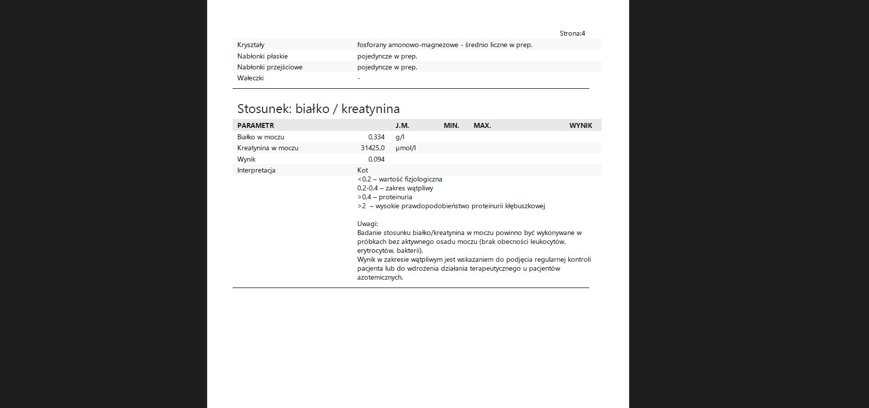 – podwyższony ciężar właściwy (zagęszczony mocz), białko w moczu
