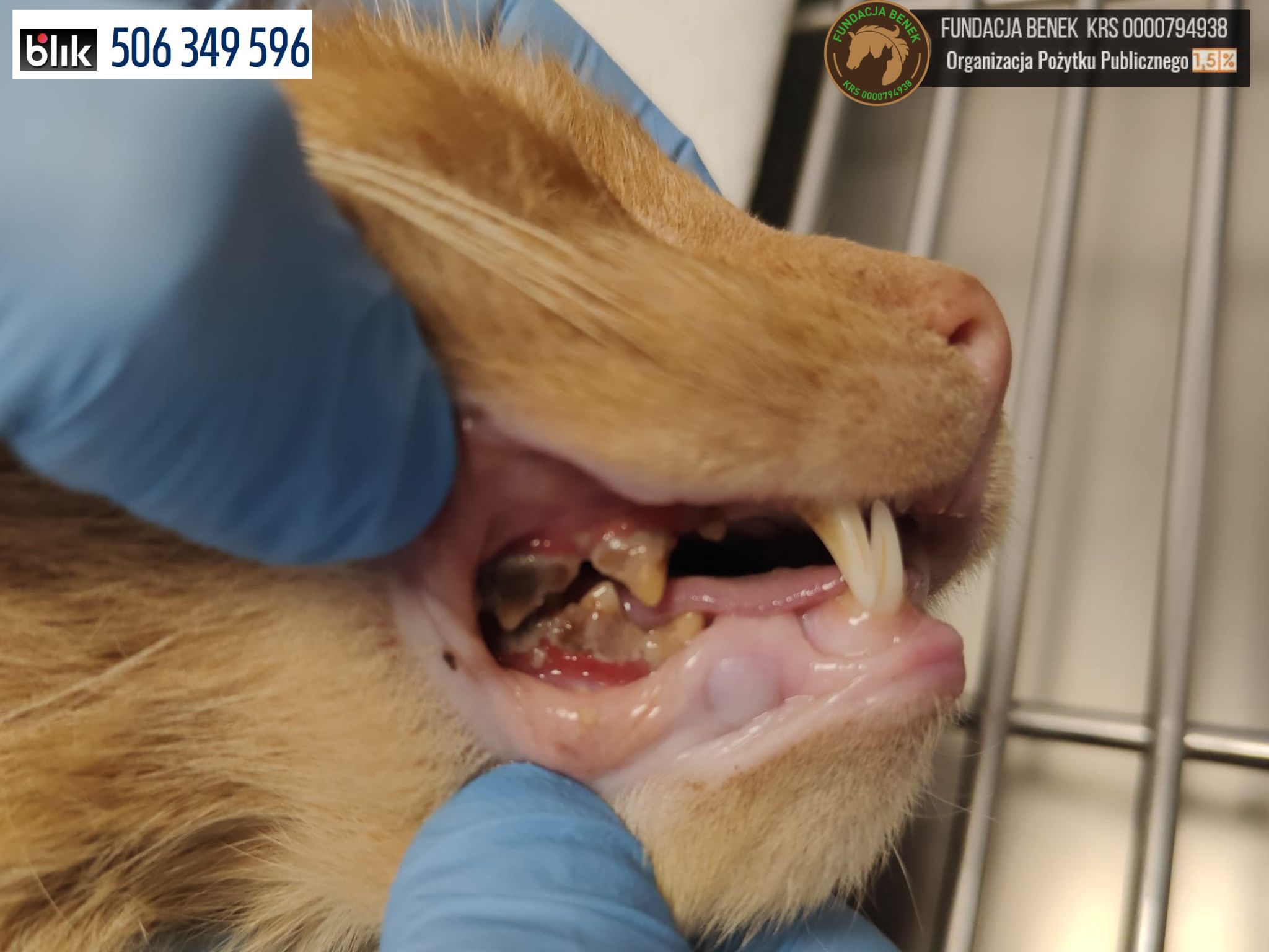 Choroba zębów postępuje szybko, a stan zapalny jest tak zaawansowany, że Ogonek nie może normalnie jeść. Chudnie, słabnie, jego organizm jest w wyczerpaniu. Weterynarz, który go badał, powiedział, że konieczne jest usunięcie kamienia i części zębów. Wtedy nie będzie cierpiał i odzyska też formę.