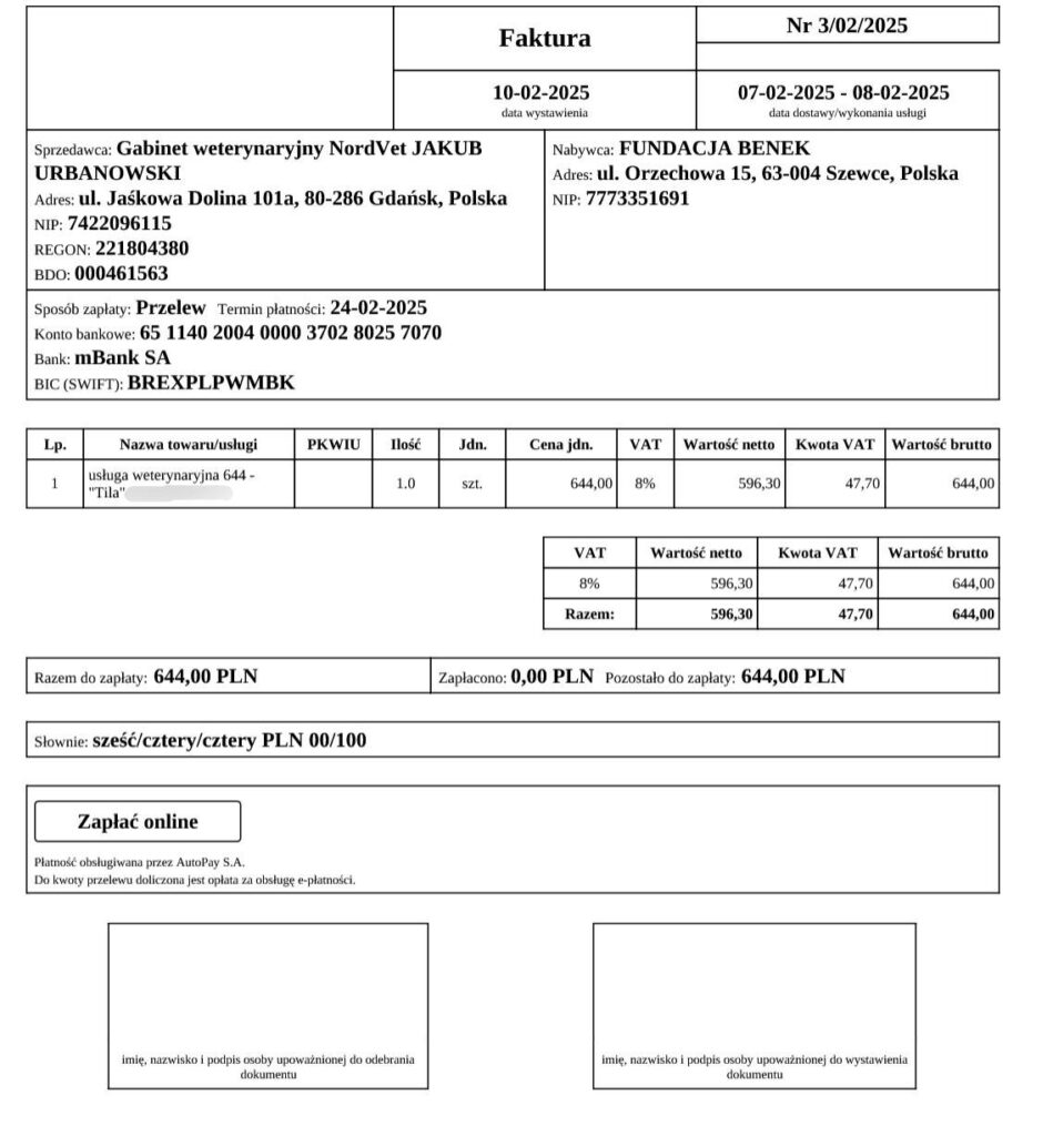 potrzebujemy pomocy w opłaceniu kolejnej operacji Tili. Jest już po lewostronnej mastektomii, konieczne były również zdjęcia RTG oraz wizyta kontrolna. Nie jest wykluczona dalsza hospitalizacja, ale tutaj pozostajemy dobrej myśli, że jednak nie będzie to konieczne. Koszta zabiegu przekroczyły dotychczas zebrane fundusze. Już teraz kwota leczenia suczki to ponad 7 700 zł.